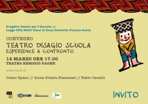 Nell’ambito delle iniziative riguardanti il progetto TEATRO PER L’ASCOLTO  in via di realizzazione nei comuni del distretto Formia / Gaeta, Mercoledì 14 marzo alle ore 17:00 si terrà presso il TEATRO REMIGIO PAONE  il CONVEGNO : TEATRO DISAGIO SCUOLA  esperienze a confronto, nel quale interverranno il Professore IVANO SPANO , titolare della cattedra di Sociologia Generale della Facoltà di Psicologia di Padova ; la Professoressa ANNAGRAZIA STAMMATI  docente di Lettere presso la casa di Reclusione di Rebibbia di Roma ; il Regista  FABIO CAVALLI  responsabile delle attività teatrali presso il carcere di Rebibbia di Roma. L’incontro sarà coordinato da Pompeo Perrone e Maurizio Stammati.